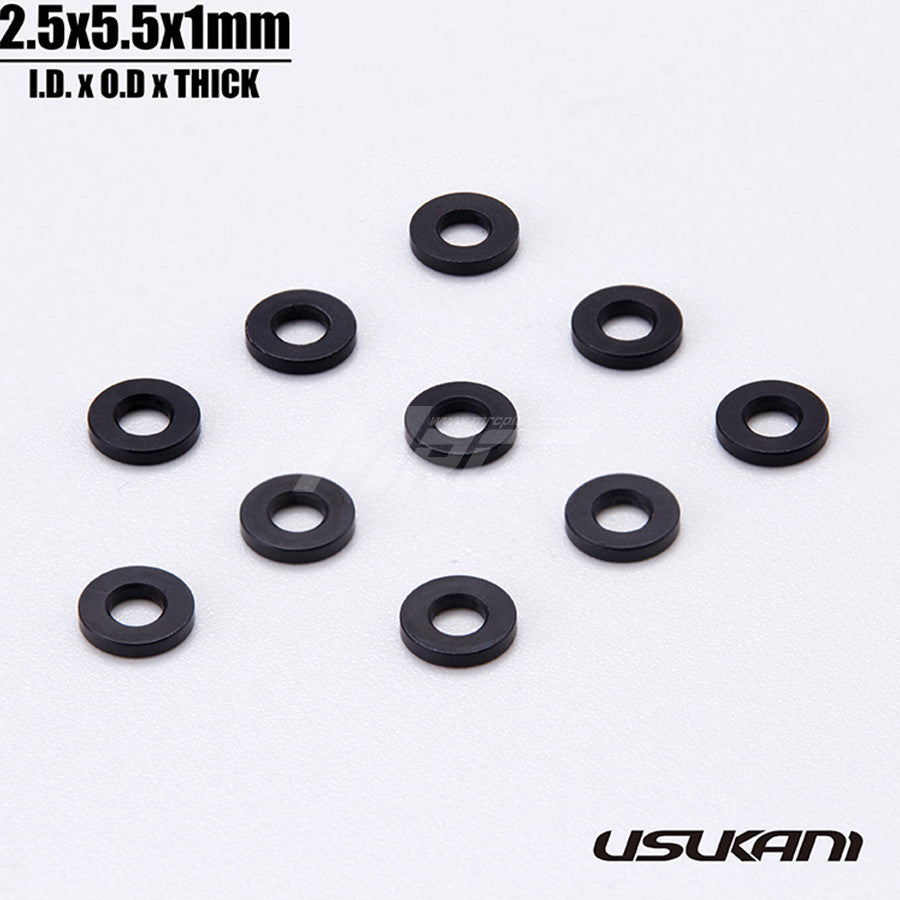 Usukani 7075 Alum. Spacer 2.5 X 5.5 - Black Feature: For: General Parts Specification: Inner Diameter: 2.5mm Outer Diameter: 5.5mm Thickness: 0.5mm - 3mm What is included: Usukani 7075 Alum. Spacer 2.5 X...